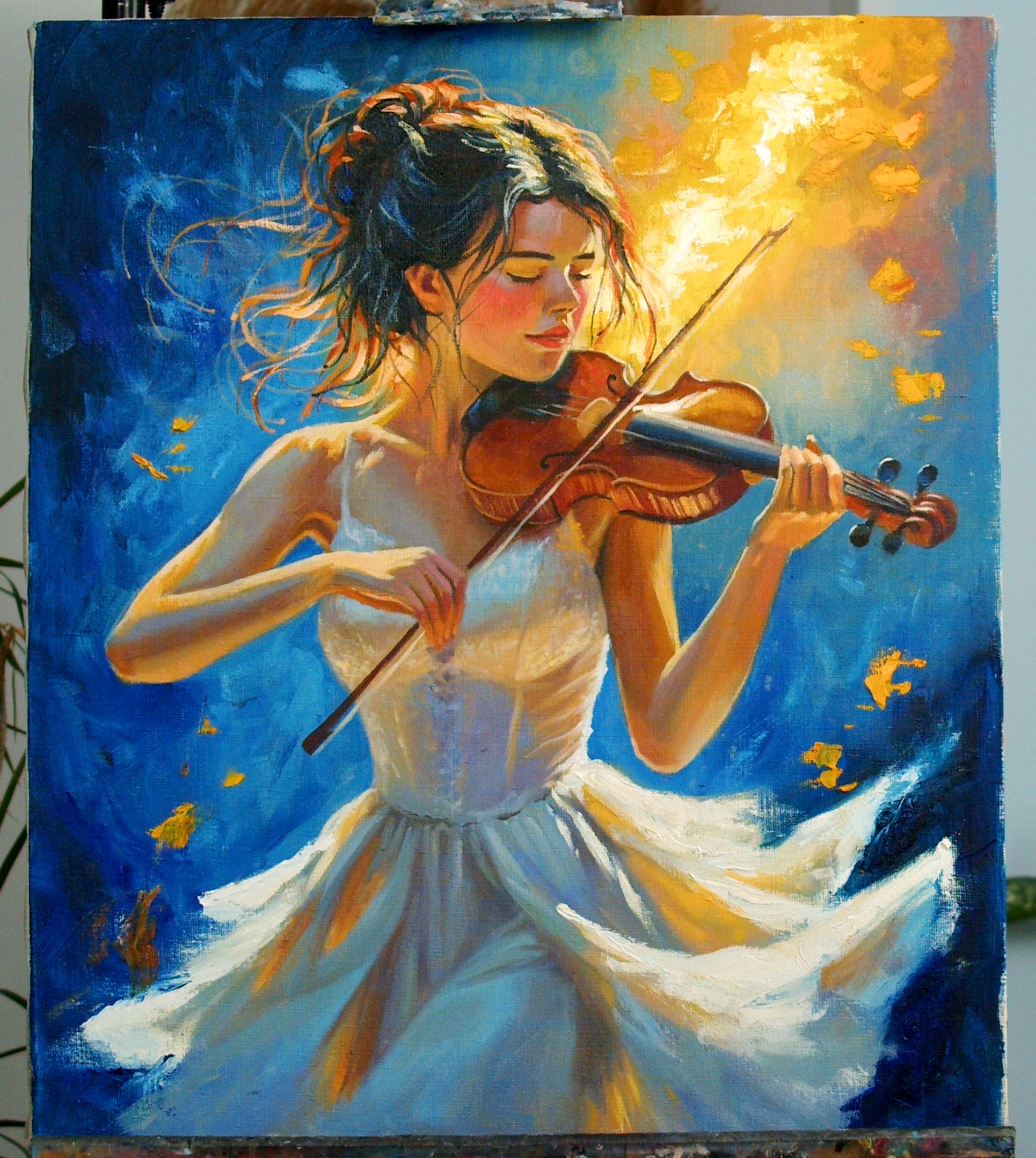 🖌️ Эта картина — гимн творчеству, вдохновению и красоте, где музыка и живопись сливаются воедино, создавая нечто большее, чем просто изображение. Это момент, когда каждый может услышать мелодию, которую играет девушка, и почувствовать её эмоции.
