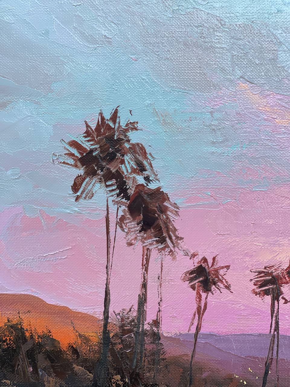 Пальмы тянутся ввысь, будто замирают в кадре старого фильма о тропиках. Гладкая, блестящая линия прибоя отражает небо. Лёгкий розовый туман растворяет контуры, а золотая дорожка от солнца на воде становится тропинкой, по которой хочется пройти босиком. Вдали — встречая вечер, загораются огоньки приморского городка.