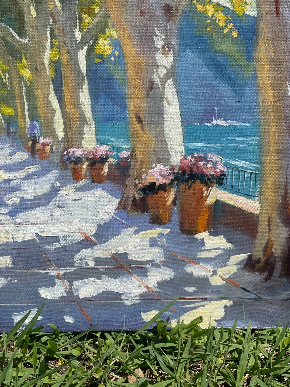 Вы идёте по аллее. Мягкие солнечные пятна ложатся на брусчатку сквозь высокие кроны платанов. Воздух тёплый, наполненный ароматом цветов и солёным дыханием моря. Уютные магазинчики под парусиновыми навесами, украшенные цветами. Сияющая гладь морской воды. В этой картине — не просто улица на морском побережье, а ощущение безмятежности, укрытой в полутенях деревьев и тихом шелесте листвы.