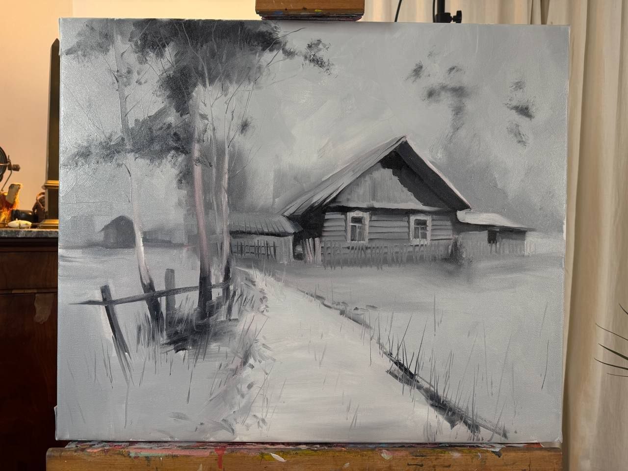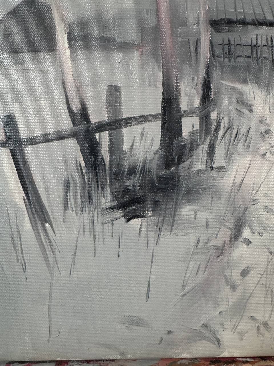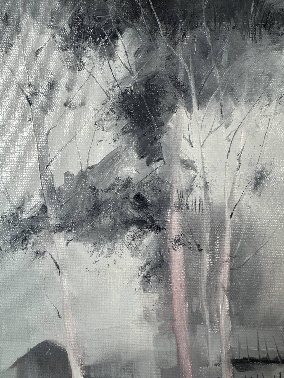 🎨 Эта работа — не столько пейзаж, сколько состояние памяти. Дом, берёзы, тропинка — всё узнаваемо, но словно ускользает, растворяется в воздухе времени. Художник не фиксирует реальность буквально — он собирает её из фрагментов воспоминаний.
