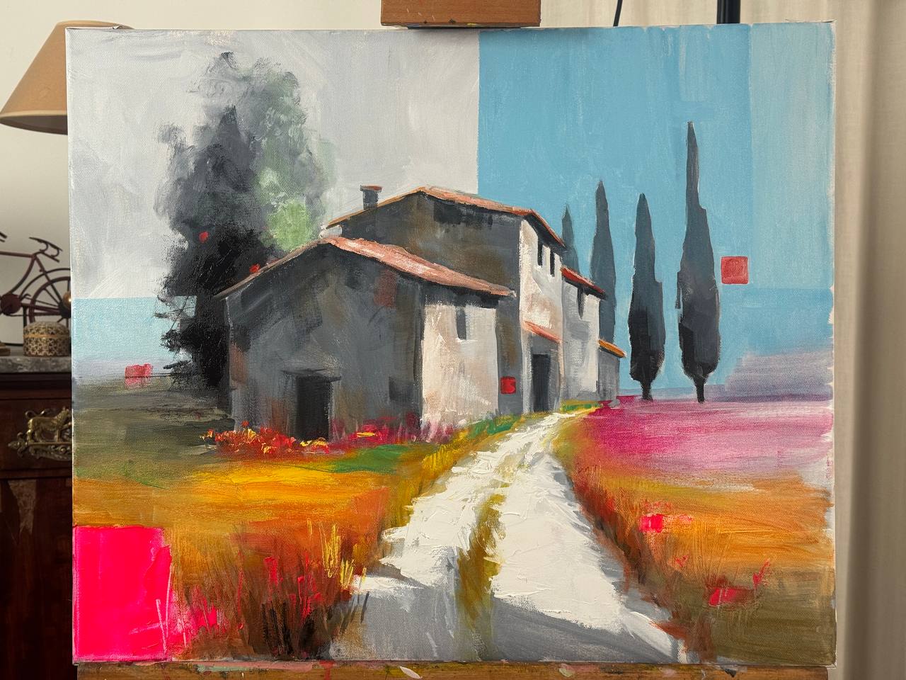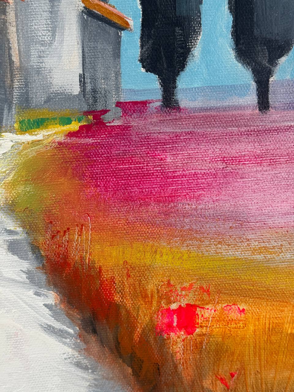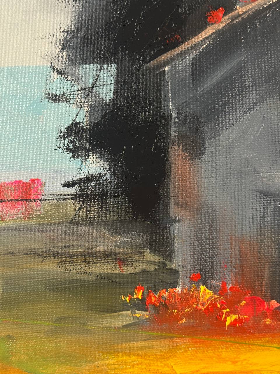 ✨Пространство картины построено на контрасте: спокойная, почти выцветшая основа и резкие, яркие цветовые вспышки. Эти насыщенные пятна не принадлежат самому пейзажу — они возникают как импульсы памяти, как внезапные возвращения чувств. Так работает детство: не линейно, а вспышками — цвет, тепло, движение, ощущение.