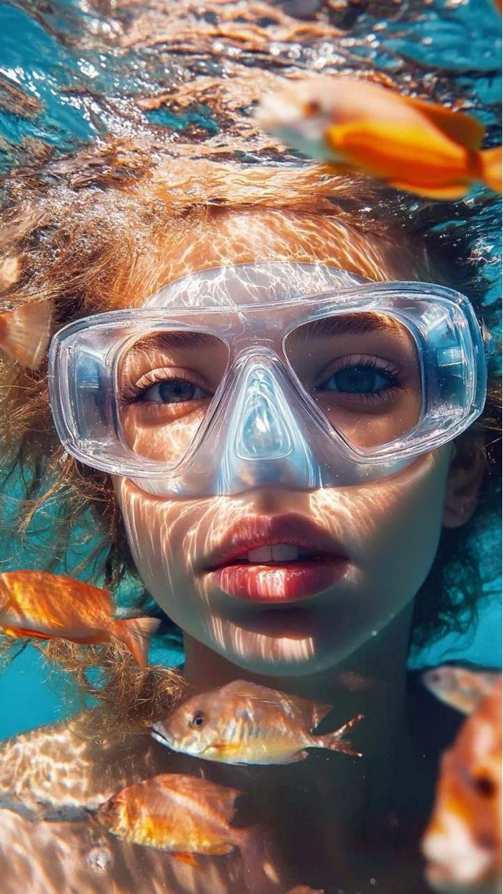 ✨ Девочка в подводном морском мире, окружённая золотыми рыбками, растворённая в акварельных бликах и лучах солнца, играющих на её коже. Это не просто портрет, а момент погружения в мир безмолвной красоты, подводных чудес и новых открытий.