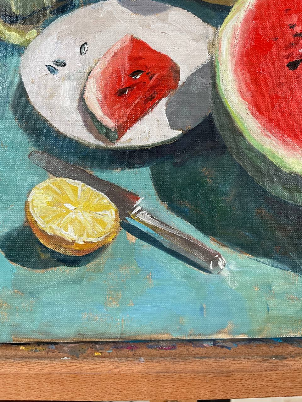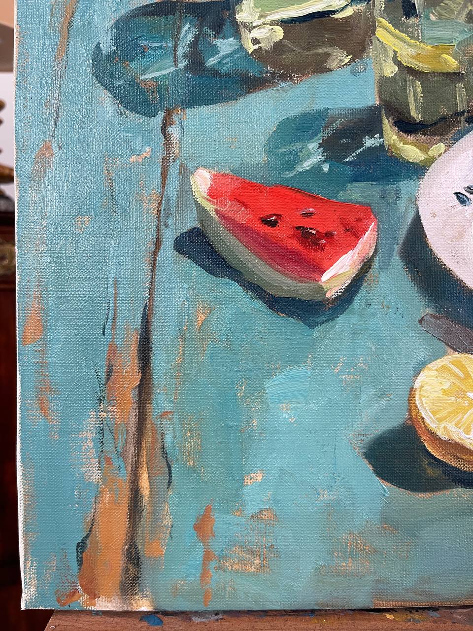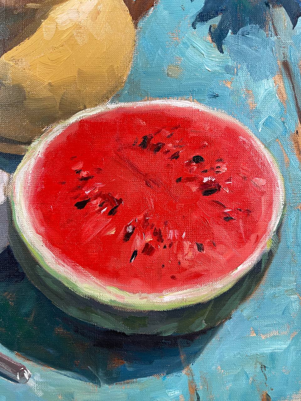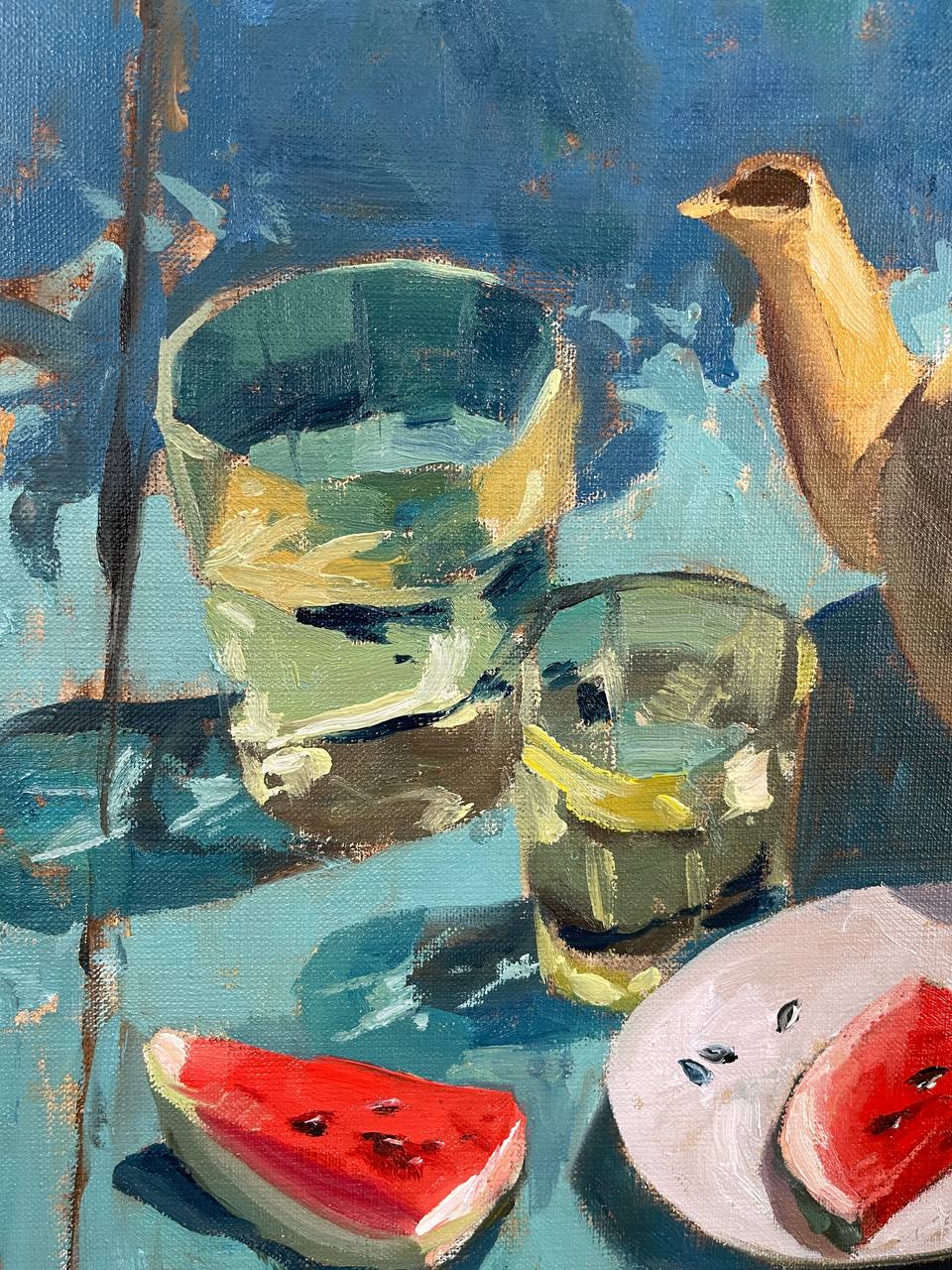 Тёплый полдень будто замер на старом столе. Солнечный свет скользит по деревянным доскам, оставляя блики на стаканах с золотистым чаем, прячется в тени чайника, обнимает сочную мякоть арбуза. Ломтик лимона блестит на свету, нож отражает отблески дня, а арбуз сочный и яркий, как само лето. Это не просто натюрморт. Это — вкус солнца, застывший на холсте.