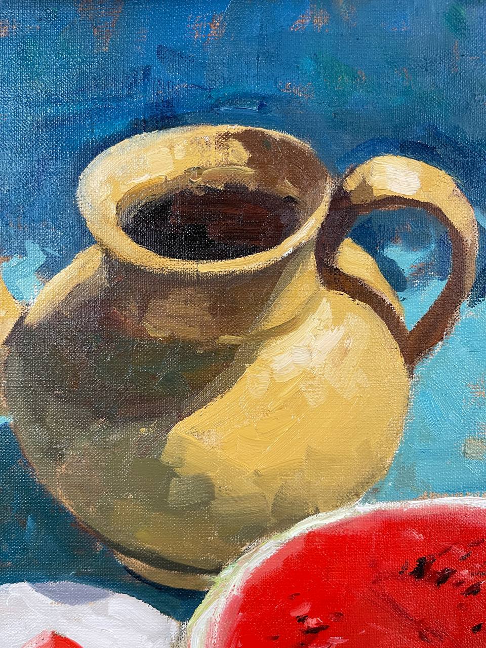 ✨Мы не просто напишем натюрморт — мы создадим ароматную, живую историю, наполненную светом и тёплым южным настроением. Эта работа — как чаепитие на веранде под кроной дерева, где тени танцуют на скатерти, а лето кажется бесконечным...